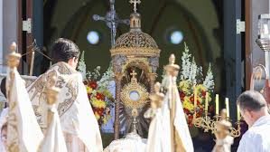 Nieodłącznym elementem świętowania tego dnia, jest procesja z Najświętszym Sakramentem do czterech ołtarzy symbolizujących cztery strony świata. Przy każdym z ołtarzy czytany jest fragment Pisma Świętego powiązany tematycznie z ustanowieniem Eucharystii. Nasz udział we Mszy Św. i procesji jest wyrazem naszej wiary w obecność Pana Jezusa, pod postaciami chleba i wina. Wyrazem naszej wiary jest także przyozdabianie trasy procesji i okien domów, modlitwy, śpiewy, zaangażowanie np, sypanie kwiatów. W tym roku, ze względu na pandemię, nie wyjdziemy z Panem Jezusem na ulice naszych miejscowości. Odbędą się procesje wokół kościoła. Ale zachęcam Was bardzo gorąco, abyście wspólnie z waszymi rodzinami, uczestniczyli w tym wielkim święcie, zachowując oczywiście środki ostrożności, mając zakryte usta i nos maseczką.